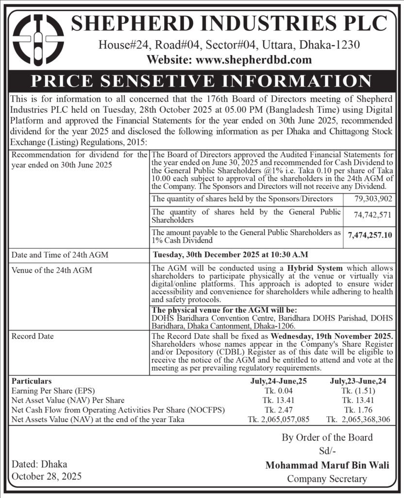 জেএমআই সিরিঞ্জের পর্ষদ সভার তারিখ ঘোষণা CASH DIVIDEND DISTRIBUTION NOTICE FOR THE YEAR 2024-2025 OF SHEPHERD INDUSTRIES PLC প্রাইম ফাইনান্সের পর্ষদ সভার তারিখ ঘোষণা আসন্ন ত্রয়োদশ জাতীয় সংসদ নির্বাচন স্থগিত চেয়ে হাইকোর্টে রিট পুঁজিবাজারে সূচক বৃদ্ধির মধ্য দিয়ে ইতিবাচক ধারায় লেনদেন শেষ হয়েছে আগামী ১২ ফেব্রুয়ারি নির্ধারিত সময়ে সাধারণ নির্বাচন ও গণভোট অনুষ্ঠিত হবে, প্রধান উপদেষ্টা ইসরাইলের বিরুদ্ধে এবার মামলার হুঁশিয়ারি জাতিসংঘ মহাসচিবের বিএসসি’র ৬ জাহাজ ক্রয়ে সরকারকে ২০৩.৪৭ কোটি টাকার চেক হস্তান্তর নগদ লভ্যাংশ পাঠিয়েছে পুঁজিবাজারে চার কোম্পানী আলহাজ্ব টেক্সটাইলের বোনাস শেয়ারে সম্মতি দেয়নি বিএসইসি